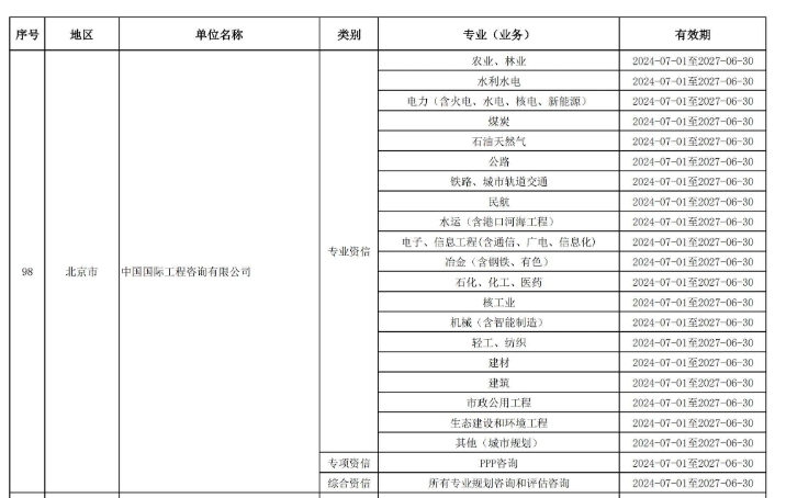 6月28日,中国工程咨询协会正式公布2����� �������Ƴ������������ �������Ƴ������������ �������Ƴ������������ �������Ƴ������024年第一批工程咨询单位甲级资信评价结果。中����� �������Ƴ������������ �������Ƴ������������ �������Ƴ������������ �������Ƴ�������咨公司申报获得了工程咨询单位甲级综合资信、PP����� �������Ƴ������������ �������Ƴ������������ �������Ƴ������������ �������Ƴ�������P咨询甲级专项资信以及20个专业的甲级专业资����� �������Ƴ������������ �������Ƴ������������ �������Ƴ������������ �������Ƴ�������信,连续7年3次蝉联我国覆盖专业最多����� �������Ƴ������������ �������Ƴ������������ �������Ƴ����������� �������Ƴ�������、最全的工程咨询机构。 预计7月1日新版资信评价证书可供下载,有����� �������Ƴ������������ �������Ƴ������������ �������Ƴ������������ �������Ƴ�������效期为3年(2024年7月1日至2027年6����� �������Ƴ����������� �������Ƴ������������ �������Ƴ������������ �������Ƴ�������月30日)。 | |||||