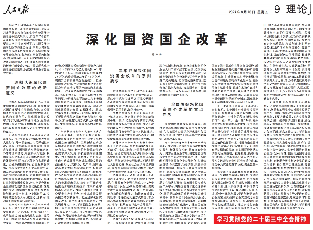 党的二十届三中全会对深化国资国����� �������Ƴ������������ �������Ƴ������������ �������Ƴ������������ �������Ƴ�������企改革进一步作出重大部署,这是以����� �������Ƴ������������ �������Ƴ������������ �������Ƴ������������ �������Ƴ�������习近平同志为核心的党中央着眼于����� �������Ƴ������������ �������Ƴ������������ �������Ƴ����������� �������Ƴ�������全面推进中国式现代化、实现第二����� �������Ƴ������������ �������Ƴ������������ �������Ƴ������������ �������Ƴ�������个百年奋斗目标作出的重要战略安排����� �������Ƴ������������ �������Ƴ������������ �������Ƴ������������ �������Ƴ�������。我们要深入学习领会习近平总书记关����� �������Ƴ����������� �������Ƴ����������� �������Ƴ������������ �������Ƴ�������于全面深化改革的重要论述,深刻认识深化国资国企����� �������Ƴ������������ �������Ƴ������������ �������Ƴ������������ �������Ƴ�������改革的战略意义,牢牢把握改革的正确方����� �������Ƴ������������ �������Ƴ������������ �������Ƴ������������ �������Ƴ������向,全力落实好各项关键任务,以更高站����� �������Ƴ������������ �������Ƴ������������ �������Ƴ����������� �������Ƴ�������位、更大力度把国资国企改革向纵深推进,����� �������Ƴ������������ �������Ƴ������������ �������Ƴ������������ �������Ƴ�������更好地履行国资国企的新责任新使命,为以中国式����� �������Ƴ������������ �������Ƴ������������ �������Ƴ������������ �������Ƴ�������现代化全面推进强国建设、民族复兴伟业作出更大贡献����� �������Ƴ����������� �������Ƴ������������ �������Ƴ������������ �������Ƴ�������。