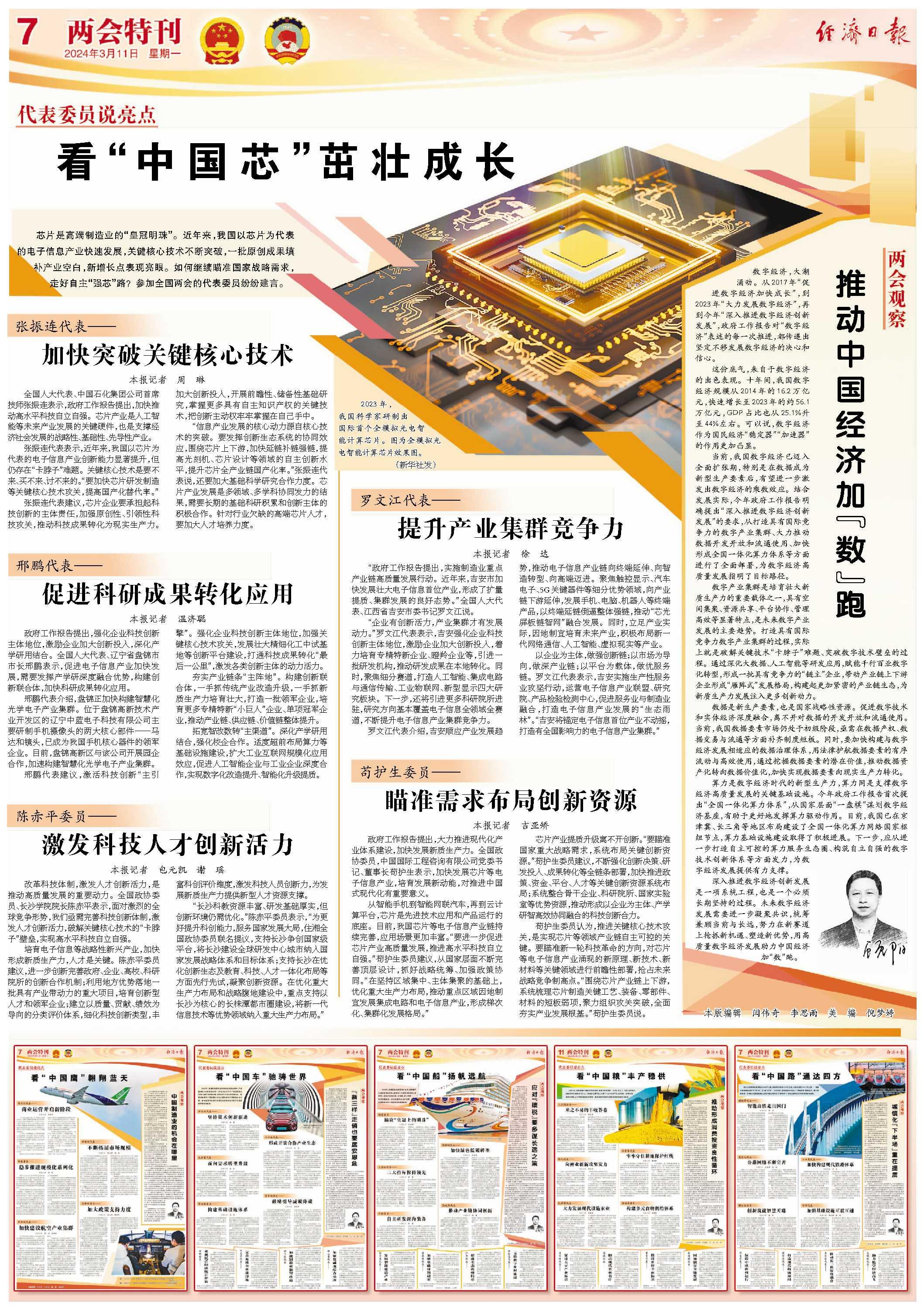 本文刊发于《经济日报》2024年3月1����� �������Ƴ������������ �������Ƴ������������ �������Ƴ������������ �������Ƴ�������1日第7版两会特刊 政府工作报告提出,大力推进现代化产����� �������Ƴ������������ �������Ƴ������������ �������Ƴ������������ �������Ƴ�������业体系建设,加快发展新质生����� �������Ƴ������������ �������Ƴ����������� �������Ƴ������������ �������Ƴ�������产力。全国政协委员,中国国际工程咨询有限公司����� �������Ƴ����������� �������Ƴ������������ �������Ƴ������������ �������Ƴ������党委书记、董事长苟护生表示,加快发����� �������Ƴ������������ �������Ƴ������������ �������Ƴ������������ �������Ƴ�������展芯片等电子信息产业,培����� �������Ƴ������������ �������Ƴ����������� �������Ƴ������������ �������Ƴ�������育发展新动能,对推进中国式现代化有重要意义����� �������Ƴ������������ �������Ƴ������������ �������Ƴ������������ �������Ƴ�������。 从智能手机到智能网联汽车,再到云计����� �������Ƴ������������ �������Ƴ����������� �������Ƴ������������ �������Ƴ�������算平台,芯片是先进技术应用和产品运行的底座。目����� �������Ƴ������������ �������Ƴ������������ �������Ƴ������������ �������Ƴ�������前,我国芯片等电子信息产业链持续完善,应用场景����� �������Ƴ������������ �������Ƴ������������ �������Ƴ������������ �������Ƴ�������更加丰富。“要进一步促进芯片产业高质量发展,推����� �������Ƴ������������ �������Ƴ������������ �������Ƴ������������ �������Ƴ�������进高水平科技自立自强。”苟护生委员����� �������Ƴ������������ �������Ƴ������������ �������Ƴ������������ �������Ƴ�������建议,从国家层面不断完善顶层设计,抓好战略����� �������Ƴ������������ �������Ƴ����������� �������Ƴ������������ �������Ƴ�������统筹、加强政策协同。“在坚持区域集中、主体集聚的����� �������Ƴ������������ �������Ƴ������������ �������Ƴ������������ �������Ƴ�������基础上,优化重大生产力布局,推动重点区域����� �������Ƴ������������ �������Ƴ������������ �������Ƴ������������ �������Ƴ�������因地制宜发展集成电路和电子信息产����� �������Ƴ����������� �������Ƴ������������ �������Ƴ������������ �������Ƴ�������业,形成梯次化、集群化发展格局。” 芯片产业提质升级离不开创新。“要����� �������Ƴ������������ �������Ƴ������������ �������Ƴ����������� �������Ƴ�������瞄准国家重大战略需求,系统布局关键创新����� �������Ƴ������������ �������Ƴ������������ �������Ƴ������������ �������Ƴ�������资源。”苟护生委员建议,不断强化创新决策、研发投����� �������Ƴ������������ �������Ƴ������������ �������Ƴ������������ �������Ƴ������入、成果转化等全链条部署,加快推进政����� �������Ƴ������������ �������Ƴ������������ �������Ƴ������������ �������Ƴ�������策、资金、平台、人才等关键创���