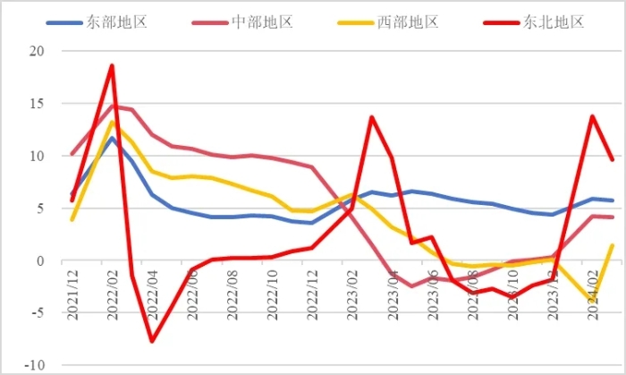 (四)区域投资形势整体向好,东北地区投资增速领先����� �������Ƴ������������ �������Ƴ������������ �������Ƴ������������ �������Ƴ�������。2024年一季度,我国东北地区一����� �������Ƴ������������ �������Ƴ������������ �������Ƴ������������ �������Ƴ�������批重大项目加快落地,投资大幅增长9.6%����� �������Ƴ������������ �������Ƴ������������ �������Ƴ������������ �������Ƴ�������,较全国水平高了5.1个百分点;京津冀、长三����� �������Ƴ������������ �������Ƴ������������ �������Ƴ������������ �������Ƴ�������角、粤港澳大湾区等动力源地����� �������Ƴ������������ �������Ƴ������������ �������Ƴ������������ �������Ƴ�������区经济较快增长,东部地区投资同����� �������Ƴ������������ �������Ƴ������������ �������Ƴ������������ �������Ƴ�������比增长5.7%,����� �������Ƴ������� �������Ƴ������������ �������Ƴ������������ �������Ƴ������������ �������Ƴ������������较全国水平高了1.2个百分点;中西部����� �������Ƴ������������ �������Ƴ������������ �������Ƴ������������ �������Ƴ�������地区产业加快转型升级,投资分别增长4.1%、1����� �������Ƴ������������ �������Ƴ������������ �������Ƴ����������� �������Ƴ�������.4%。
