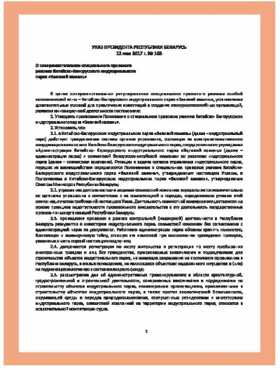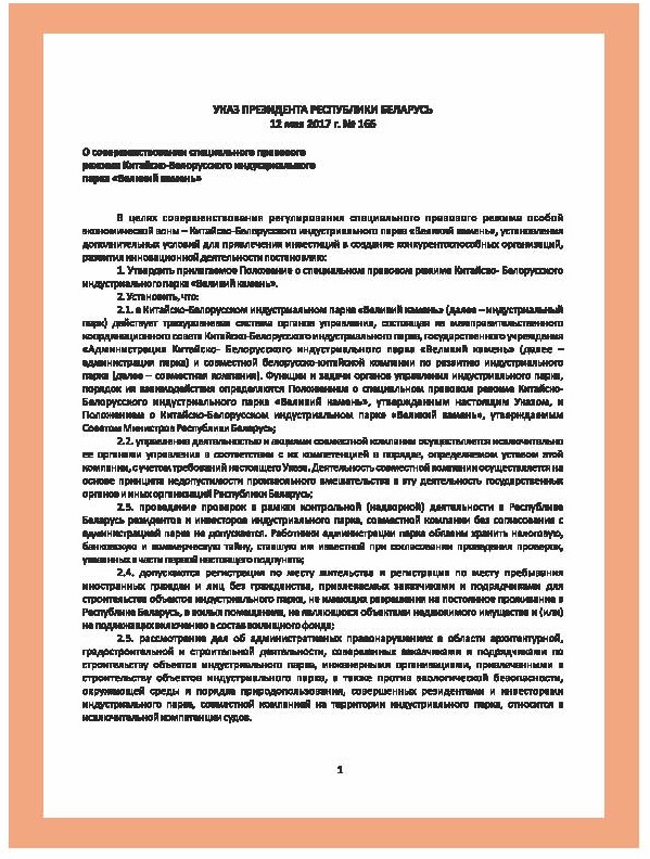 2017年5月12日,针对中白工业����� �������Ƴ������������ �������Ƴ������������ �������Ƴ������������ �������Ƴ�������园的第166号总统令正式颁布生效。����� �������Ƴ������������ �������Ƴ������������ �������Ƴ������������ �������Ƴ�������该版总统令是以中咨公司编制的《关于完善中白����� �������Ƴ������������ �������Ƴ������������ �������Ƴ����������� �������Ƴ�������工业园管理政策和体制机制的建议报����� �������Ƴ������������ �������Ƴ������������ �������Ƴ������������ �������Ƴ�������告》为蓝本,对管理体制、税收优惠����� �������Ƴ����������� �������Ƴ������������ �������Ƴ����������� �������Ƴ�������政策、员工免签入境待遇等方面进行����� �������Ƴ������������ �������Ƴ������������ �������Ƴ����������� �������Ƴ�������了修订。卢卡申科总统还另外签发了����� �������Ƴ������������ �������Ƴ������������ �������Ƴ����������� �������Ƴ�������《关于建立中华人民共和国公民出入境免签制度》����� �������Ƴ������������ �������Ƴ������������ �������Ƴ����������� �������Ƴ�������的第173号总统令,极大����� �������Ƴ������������ �������Ƴ������������ �������Ƴ������������ �������Ƴ�������简化了中方人员赴白俄罗斯的手续,促进了中����� �������Ƴ����������� �������Ƴ������������ �������Ƴ������������ �������Ƴ�������白两国民间交流。