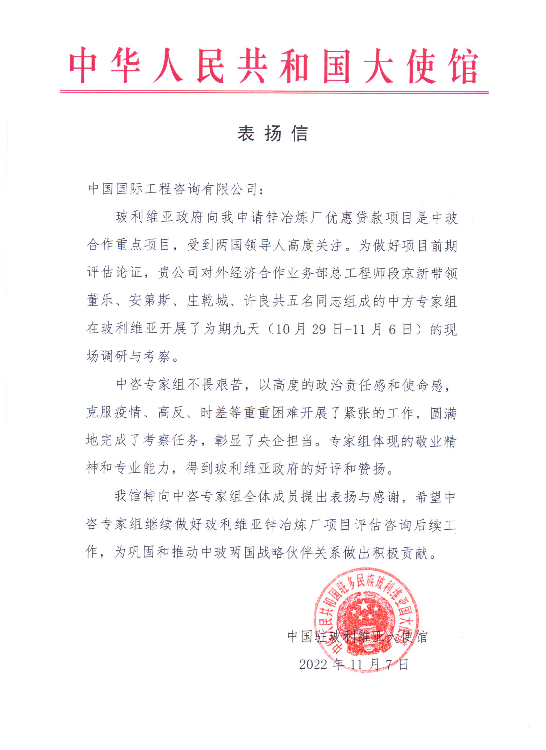 考察组在组长段京新同志的带领下,经过前期在国内五����� �������Ƴ����������� �������Ƴ������������ �������Ƴ������������ �������Ƴ�������个多月的充分准备,在玻九天里以高度的责����� �������Ƴ������������ �������Ƴ������������ �������Ƴ������������ �������Ƴ�������任心每天十几个小时的高强度工作。段京新组长以����� �������Ƴ������������ �������Ƴ������������ �������Ƴ������������ �������Ƴ�������身作则,带领考察组克服疫情、����� �������Ƴ������������ �������Ƴ������������ �������Ƴ������������ �������Ƴ�������高反、时差等重重困难,主持与����� �������Ƴ������������ �������Ƴ������������ �������Ƴ������������ �������Ƴ������各方的会谈以及现场调研与沟通,始终秉����� �������Ƴ������������ �������Ƴ������������ �������Ƴ������������ �������Ƴ������持积极的工作态度、严谨的工作作风、����� �������Ƴ������������ �������Ƴ������������ �������Ƴ������������ �������Ƴ�������务实的合作理念、科学的评估实践。各位组员充分发扬����� �������Ƴ������������ �������Ƴ������������ �������Ƴ����������� �������Ƴ�������中咨精神,在工作中体现的专业能力和敬业精神得到����� �������Ƴ������������ �������Ƴ����������� �������Ƴ������������ �������Ƴ�������驻玻使馆和玻以矿业冶金部为����� �������Ƴ������������ �������Ƴ������������ �������Ƴ������������ �������Ƴ�������首的各政府部门的认可和赞����� �������Ƴ������������ �������Ƴ������������ �������Ƴ������������ �������Ƴ�������扬。在回国转机途中考察组就收到了来自中国����� �������Ƴ������������ �������Ƴ������������ �������Ƴ������������ �������Ƴ�������驻玻利维亚大使馆的表扬信,信中着重强调了中咨考察����� �������Ƴ������������ �������Ƴ������������ �������Ƴ������������ �������Ƴ�������组不畏艰苦,以高度的政治责����� �������Ƴ������������ �������Ƴ������������ �������Ƴ������������ �������Ƴ�������任感和使命感,圆满完成考察����� �������Ƴ������������ �������Ƴ������������ �������Ƴ������������ �������Ƴ�������任务,得到玻利维亚政府的好评和赞����� �������Ƴ������������ �������Ƴ������������ �������Ƴ����������� �������Ƴ�������扬,并特向中咨专家组全体成员提出����� �������Ƴ������������ �������Ƴ������������ �������Ƴ������������ �������Ƴ�������表扬与感谢。