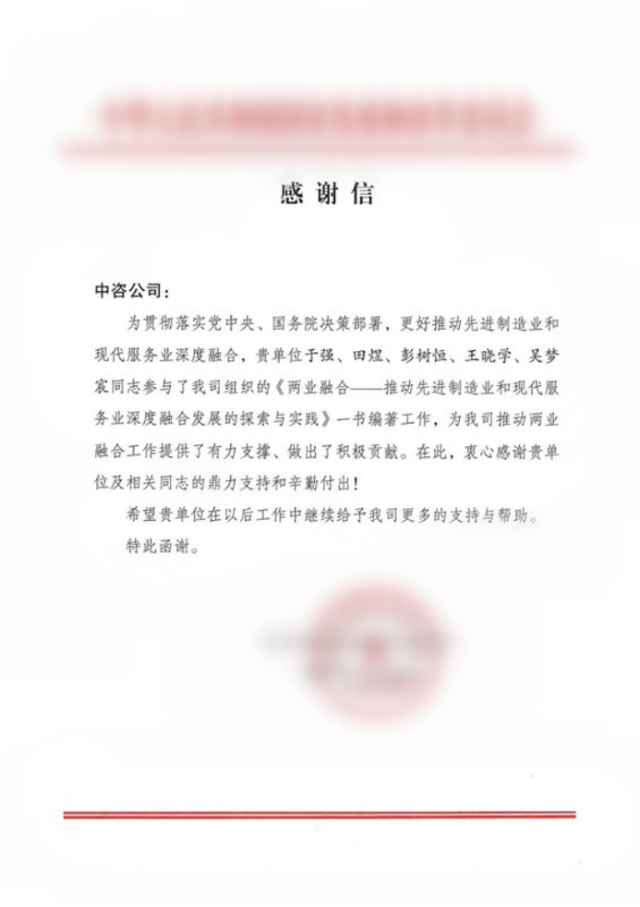 日前,中咨公司收到国家发展改革委产业����� �������Ƴ������������ �������Ƴ������������ �������Ƴ������������ �������Ƴ�������发展司发来的感谢信,对公司在支撑����� �������Ƴ������������ �������Ƴ����������� �������Ƴ������������ �������Ƴ�������国家推进“两业融合”有关工作,����� �������Ƴ������������ �������Ƴ������������ �������Ƴ������������ �������Ƴ�������以及参与《“两业融合”推动先进制造业和现代服����� �������Ƴ����������� �������Ƴ������������ �������Ƴ����������� �������Ƴ�������务业深����� �������Ƴ���������� �������Ƴ������������ �������Ƴ����������� �������Ƴ����������� �������Ƴ��������度融合发展的探索与实践》书籍编纂中的贡献����� �������Ƴ������������ �������Ƴ����������� �������Ƴ������������ �������Ƴ�������给予充分肯定。
